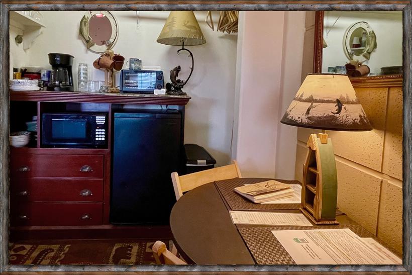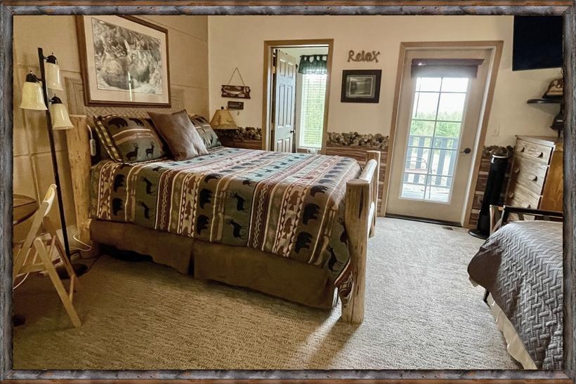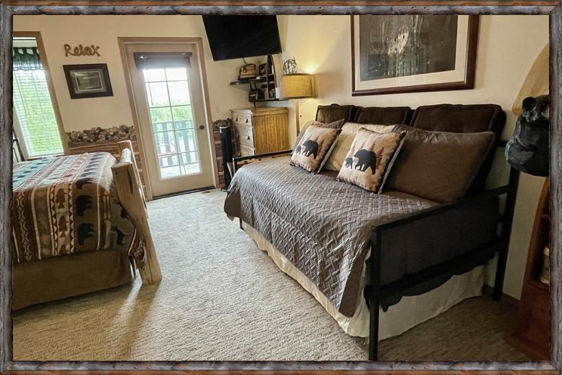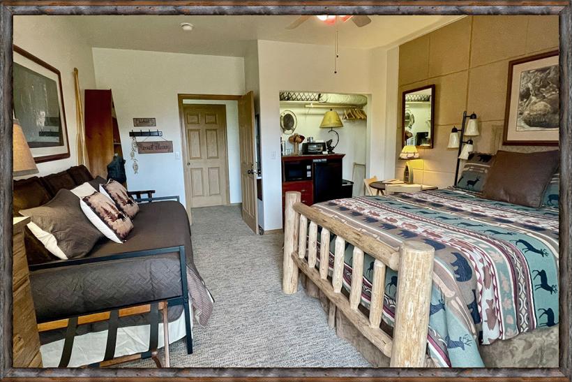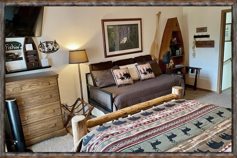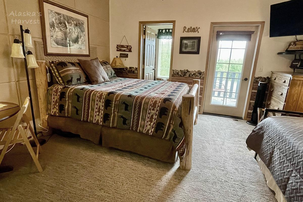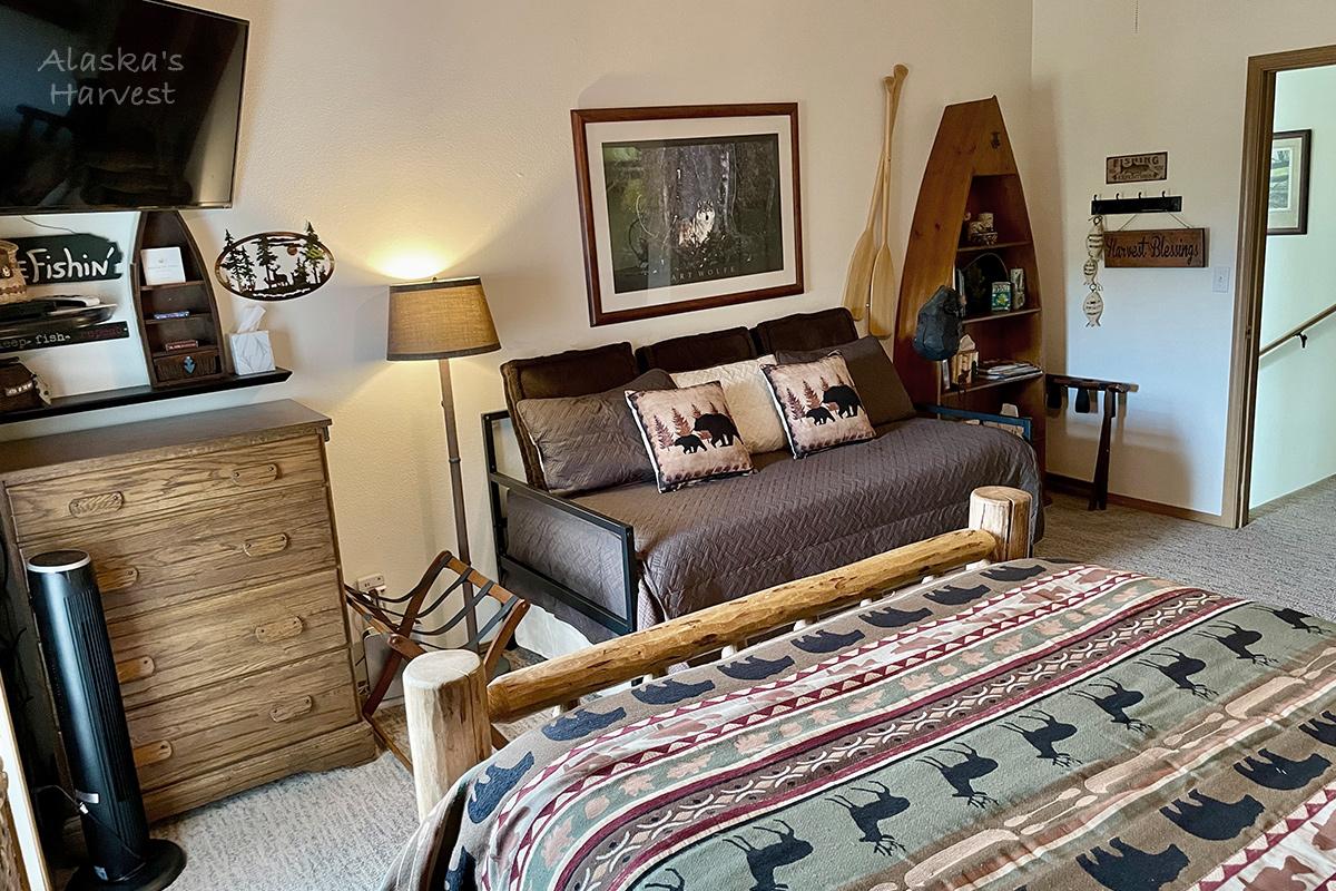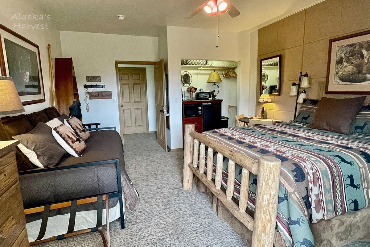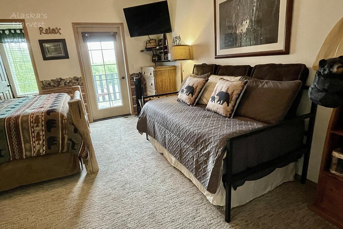 This is Creekside. It has a queen size bed and a daybed. It is on the second floor and has 2 windows that frame our awesome view of Pioneer Peak and look into the surrounding forest. It has full private bath, private balcony and a small kitchenette. Kitchenette includes small refrigerator / freezer, microwave oven, toaster oven, coffee maker, and is fully stocked with a generous continental breakfast to be eaten at your leisure. Room darkening shades. Rent this room NOW!