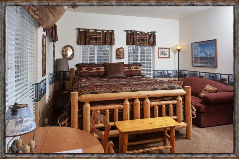 The Reindeer Room has a king size bed and a private door to a full private bath. It is on the second floor and has 4 windows that look into the surrounding forest. Includes blackout blinds and a small kitchenette. Lock this room in NOW, it fills quickly!